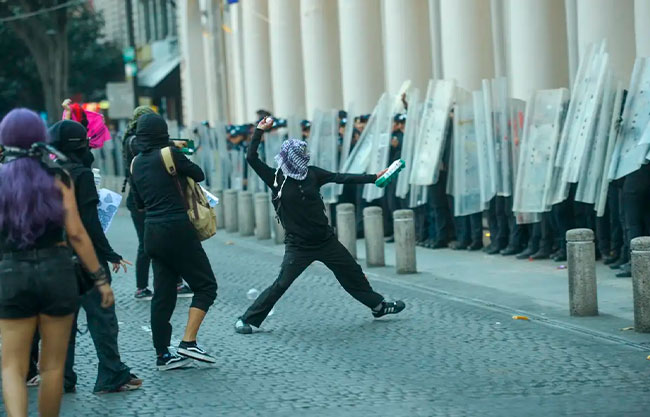En Xalapa, la jornada registró momentos de fricción cuando un grupo de manifestantes intentó realizar pintas en la fachada del Palacio de Gobierno