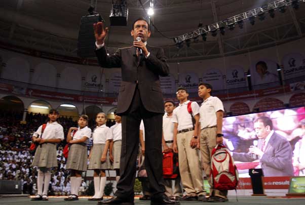 En el centro del ruedo, acompañado por niños vistiendo los uniformes escolares, descartó las críticas que califican de populistas los programas de uniformes, zapatos, útiles y desayunos escolares, pues reiteró son vitales para muchas familias, que con ellos evitan que sus hijos deserten de la escuela.