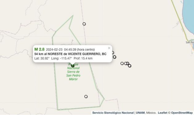Un nuevo microsismo se registró este viernes 23 de febrero de 2024 en Baja California. El temblor ocurrió a las 4:45 horas a 54 kilómetros al noreste de Vicente Guerrero y fue de magnitud 2.8.