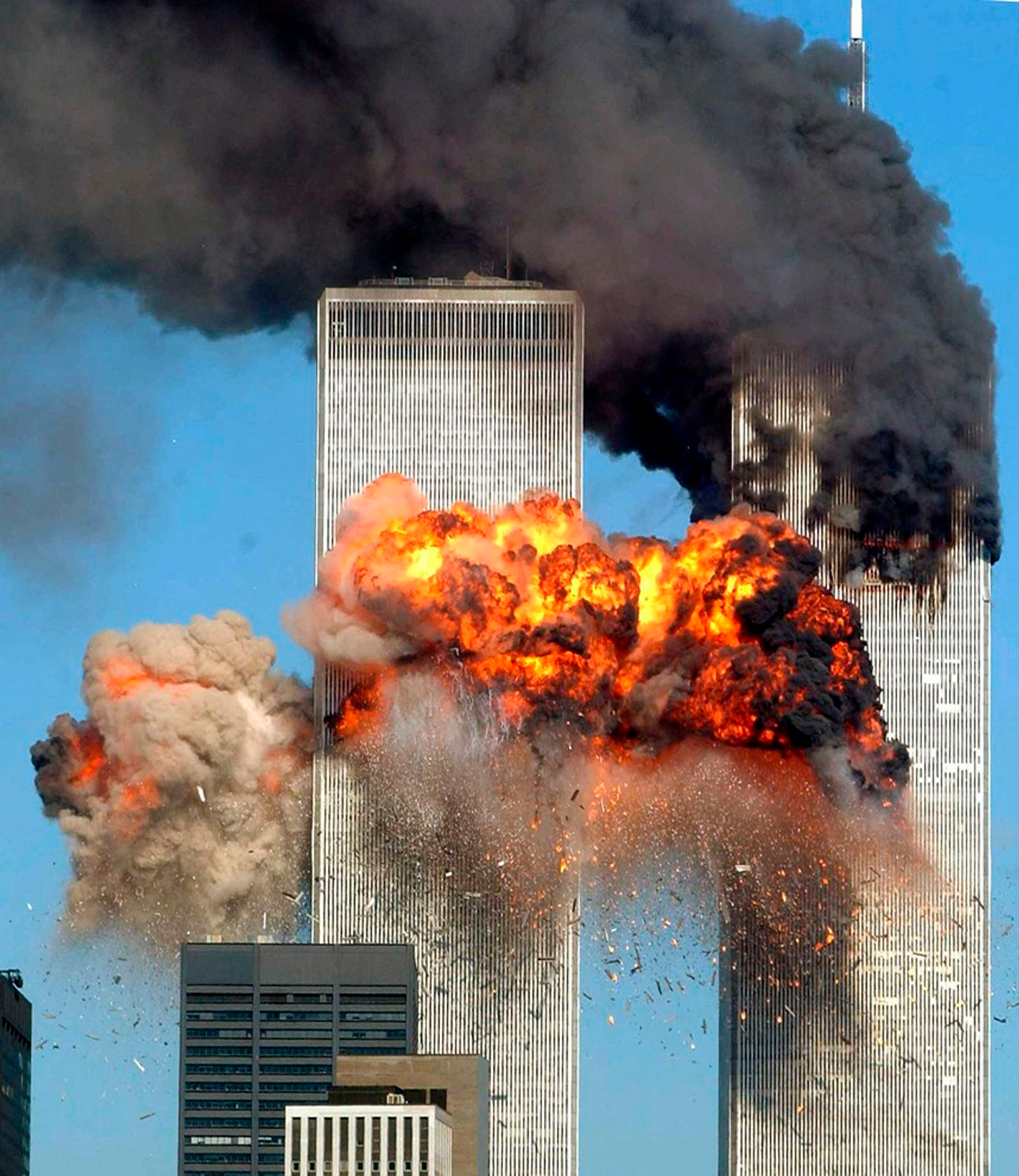 El vuelo 175 de United Airlines, un Boeing 767, se estrella contra la Torre Sur del WTC entre los pisos 77 y 85, causando una gigantesca explosión.