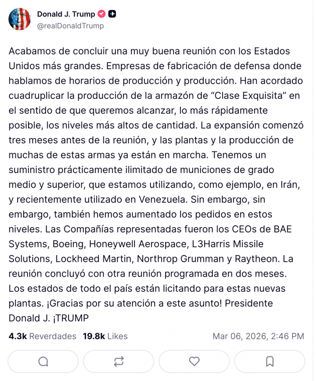 “ Acabamos de concluir una excelente reunión con las mayores empresas manufactureras de defensa de EU, donde discutimos la producción y los cronogramas de producción”, posteó en Truth Social.