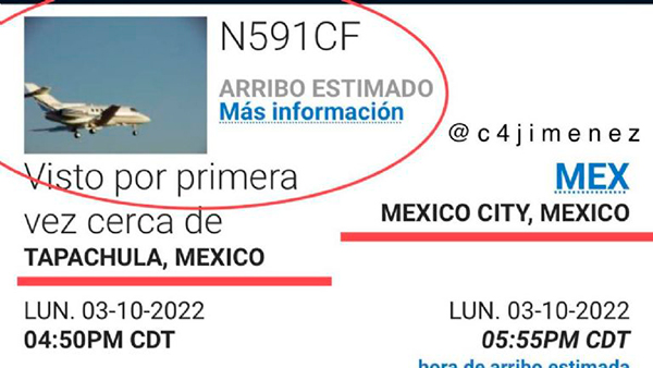 Según el registro del vuelo compartido por el periodista Carlos Jiménez a través de su cuenta de Twitter, la aeronave llegó desde el pasado lunes 3 de octubre de 2022 de un vuelo procedente de la ciudad de Tapachula, Chiapas. El avión partió de la zona chiapaneca a las 4:50 de la tarde, según el reporte.