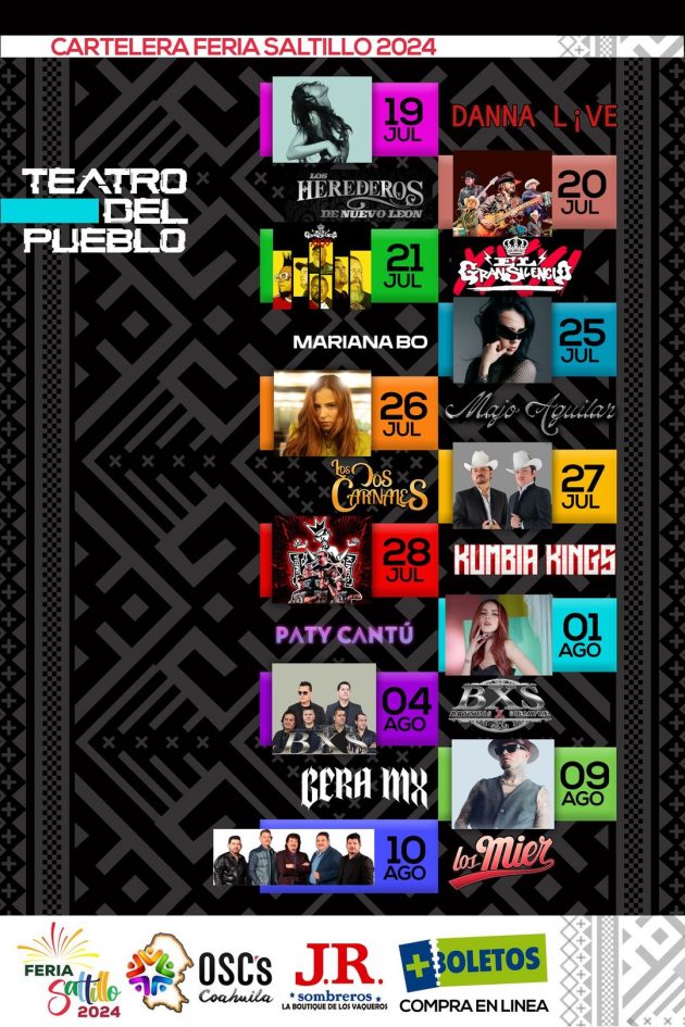 Saltillo.- Organizadores de la Feria saltillo 2024 revelaron la cartelera completa para el escenario del Teatro del Pueblo, en donde predominan los artistas de pop en español.