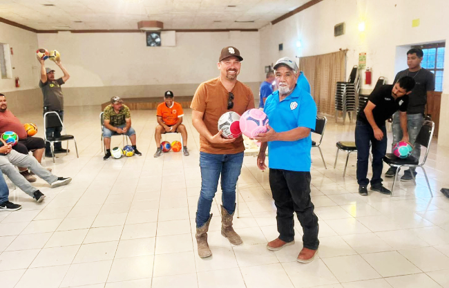 Allende, Coahuila.- El director de Fomento Deportivo, Édgar Pérez, y Eloy Galaviz, comisionado en Futbol en representación del alcalde Ricardo Treviño Guevara, llevaron a cabo la entrega de balones a los equipos que participarán en la Liga de Futbol Varonil categoría Libre.