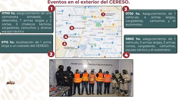 El saldo de la revuelta al exterior del penal fue de cinco detenidos, 17 armas largas y cinco cortas decomisadas, así como cuatro vehículos asegurados.