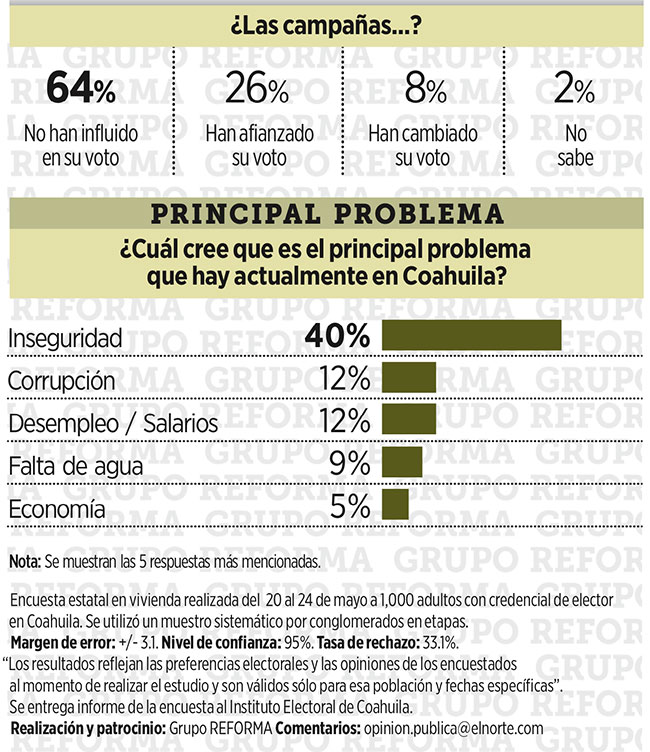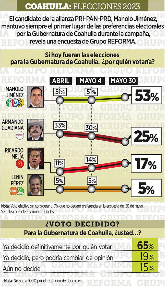 Saltillo, Coah.- El candidato de la alianza PRI-PAN-PRD, Manolo Jiménez, mantuvo siempre el primer lugar de las preferencias electorales por la Gubernatura de Coahuila durante la campaña, revela una encuesta de Grupo Reforma.