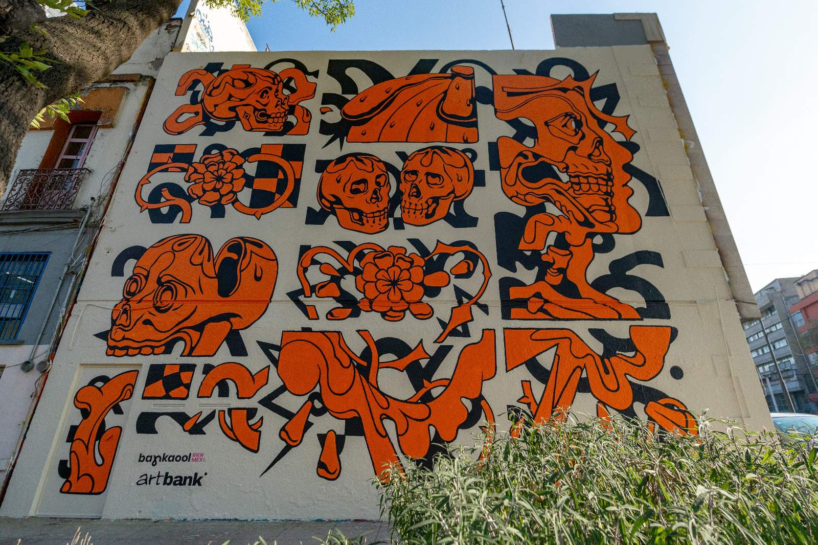 Muralista con estilo urbano, gráfico y símbolos que evocan a lo mexicano con una mirada contemporánea, vemos un mural gigante que nos recuerda al Día de Muertos.