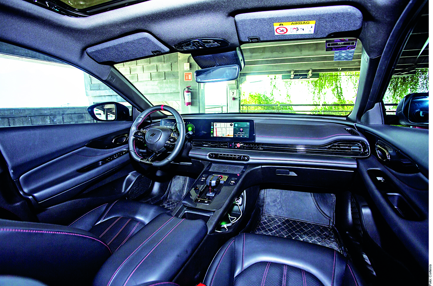 La cabina es deportiva, pues ofrece aplicaciones tipo fibra de carbón en puertas y consola y detalles rojos en el volante, puertas y asientos.