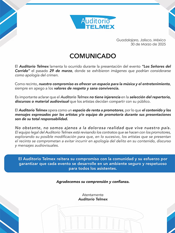 En un comunicado difundido la noche del domingo 30 de marzo, el Auditorio Telmex lamentó lo ocurrido y aseguró que, como recinto, no participa en la elaboración del contenido de los espectáculos contratados por terceros. “El Auditorio Telmex no tiene injerencia en la selección del repertorio, discursos o material audiovisual que los artistas decidan compartir con su público”, señaló.