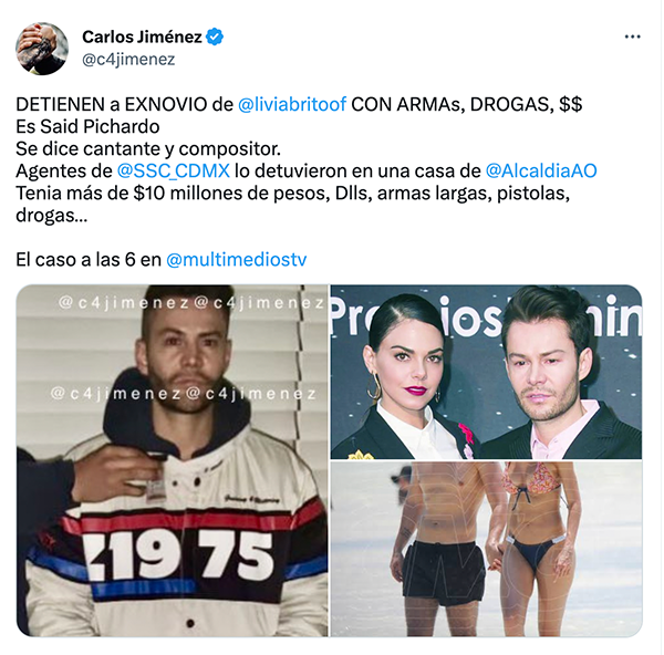 Jiménez compartió en su famosa cuenta de Twitter: “Detienen a ex novio de Livia Brito con armas, drogas, dinero. Es Said Pichardo, se dice cantante y compositor. Agentes de la Secretaría de Seguridad Ciudadana de la Ciudad de México lo detuvieron en una casa de la alcaldía Álvaro Obregón. Tenía más de diez millones de pesos, dólares, armas largas, pistolas, drogas”.