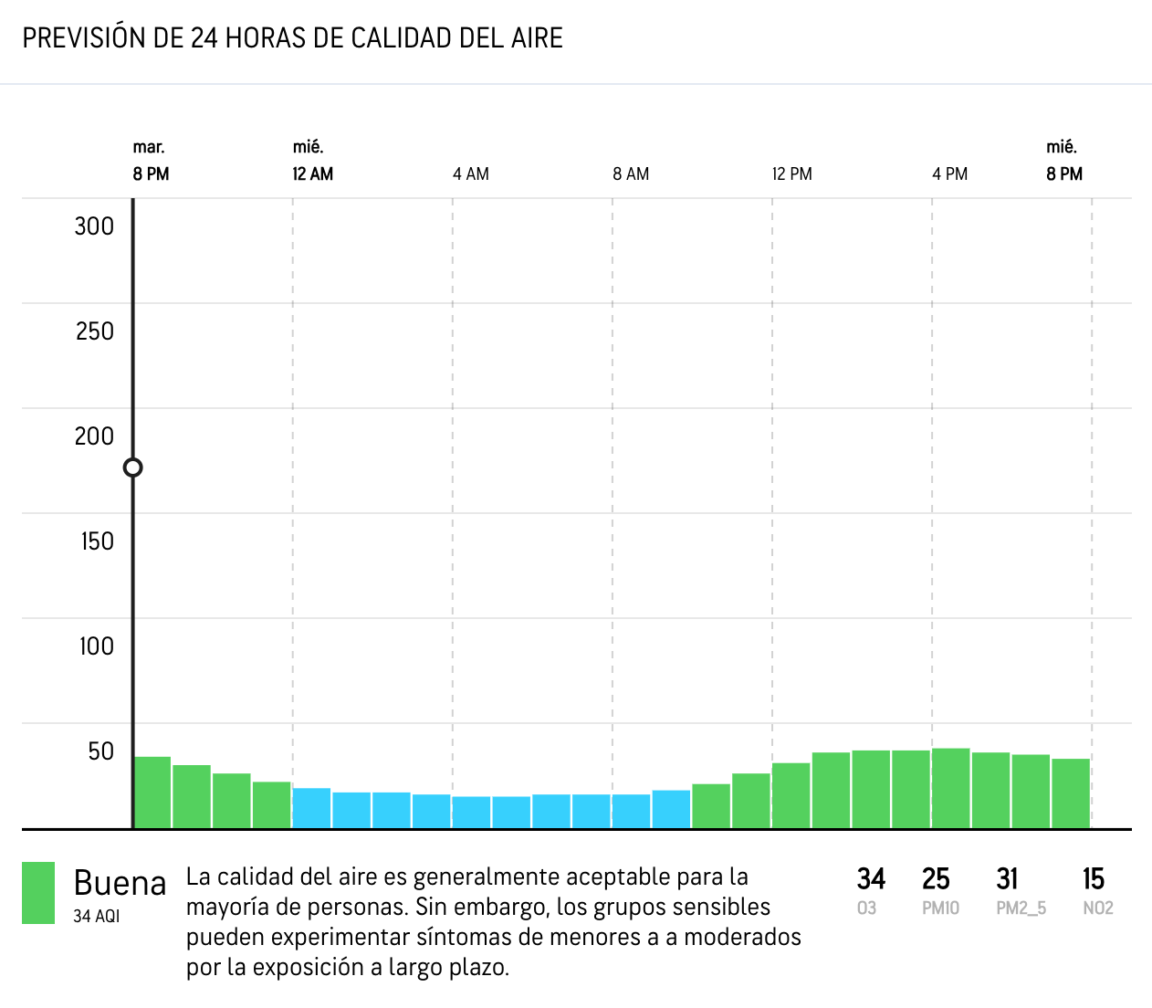 Las concentraciones de partículas finas (PM2.5) son de aproximadamente 12 µg/m³, mientras que las partículas más grandes (PM10) se encuentran en 30 µg/m³. Se espera que los vientos soplen predominantemente del Norte con velocidades bajas, alrededor de 3 a 21 km/h. La temperatura actual es de aproximadamente 22°C.