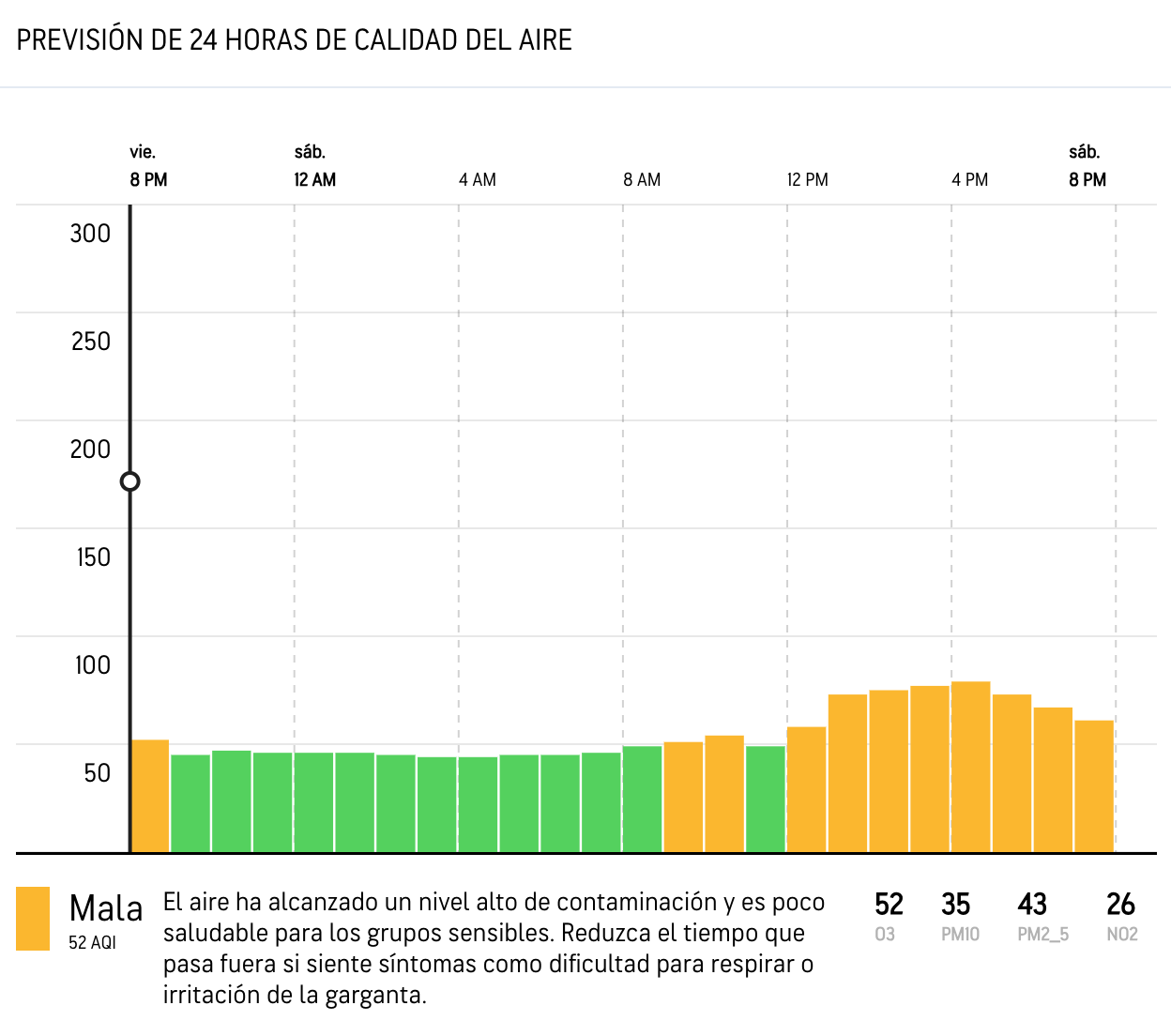 La categoría “Moderada” indica que la calidad del aire es aceptable. Sin embargo, existe una preocupación moderada para la salud de un grupo muy pequeño de personas que son inusualmente sensibles a la contaminación del aire.
