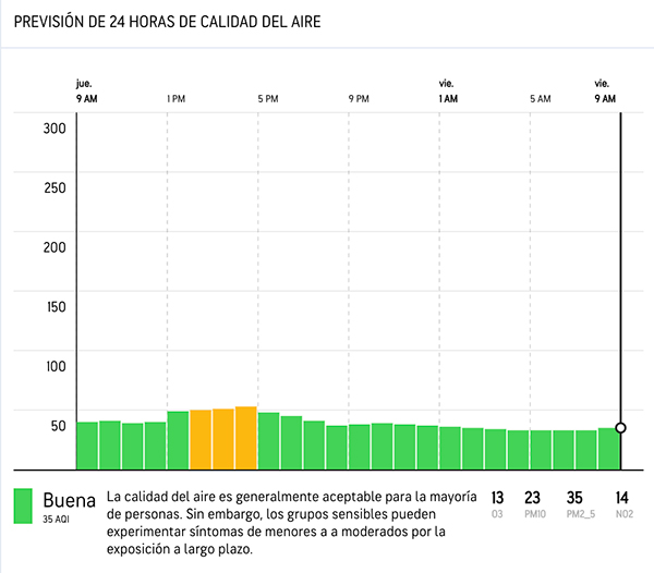 Gracias a la humedad de esta mañana los niveles de AQI se mantienen en 38 lo que facilita las actividades vigorosas al aire libre.