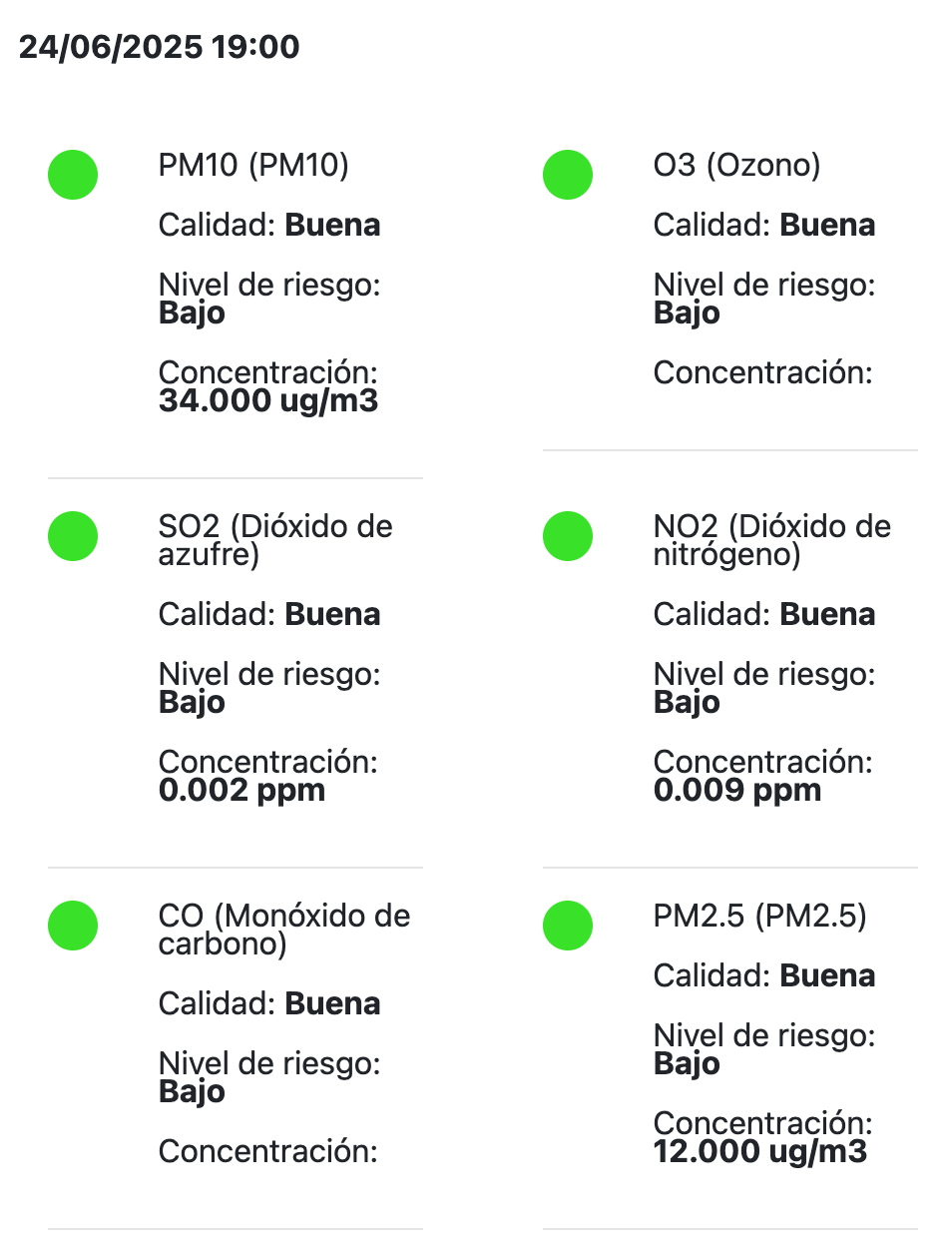 Las estaciones de monitoreo de calidad del aire cuentan con equipo para medir monóxido de carbono (CO), dióxido de azufre (SO2), dióxido de nitrógeno (NO2), ozono (O3), partículas menores o iguales a 10 micras (PM10) y partículas menores o iguales a 2.5 micras (PM2.5).