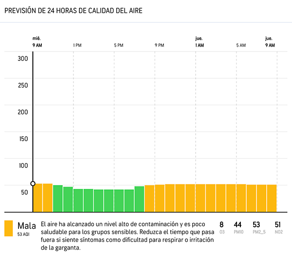 El pronostico para el resto de la mañana es que se mantenga el nivel de AQI por encima de los 50 puntos lo que no es muy recomendable, esto debido al ambiente seco que prevalece en la ciudad y el aire fresco que causan una inversión térmica.