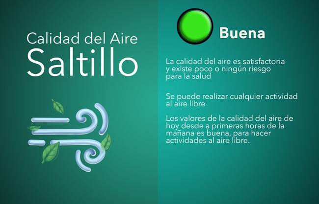 Saltillo, Coah.- Este martes 8 de abril la calidad del aire se ha mantenido en fase verde. La calidad del aire hoy es bueno, con un índice bajo. Esto significa que el aire es fresco y limpio, ideal para actividades al aire libre.