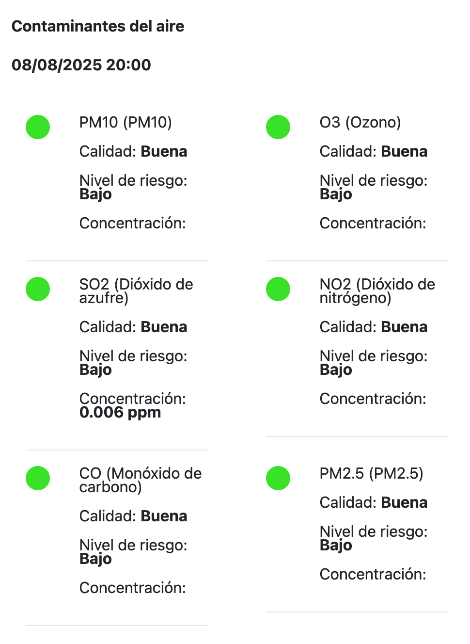 Las estaciones de monitoreo de calidad del aire cuentan con equipo para medir monóxido de carbono (CO), dióxido de azufre (SO2), dióxido de nitrógeno (NO2), ozono (O3), partículas menores o iguales a 10 micras (PM10) y partículas menores o iguales a 2.5 micras (PM2.5).