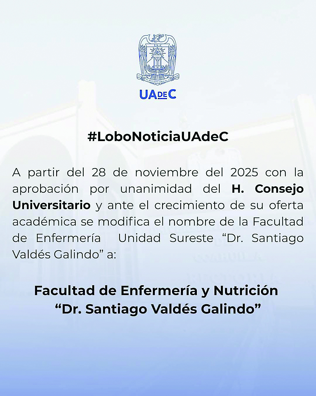 El cambio de denominación de la Facultad de Enfermería Dr. Santiago Valdés Galindo de la Unidad Sureste, que a partir de ahora se nombrará Facultad de Enfermería y Nutrición Dr. Santiago Valdés Galindo, responde a la propuesta presentada en octubre de 2025 por el director de la Facultad, Pedro Enrique Trujillo Hernández, ante la Comisión General Permanente de Planeación.