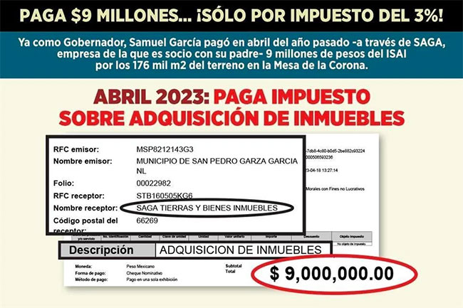 Documentación muestra que el 18 de abril del 2023 la empresa del Gobernador pagó el Impuesto Sobre Adquisición de Inmuebles (ISAI) ante el Municipio de San Pedro por 9 millones de pesos.