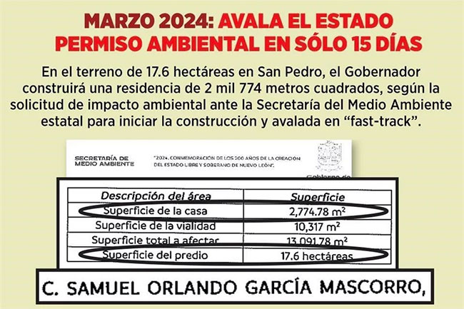 La autorización para el impacto ambiental en el inmueble le fue dada por el Estado al Gobernador en “fasttrack”, en un plazo de 15 días naturales, cuando este trámite puede tardar hasta 90 días naturales, de acuerdo con la ley.