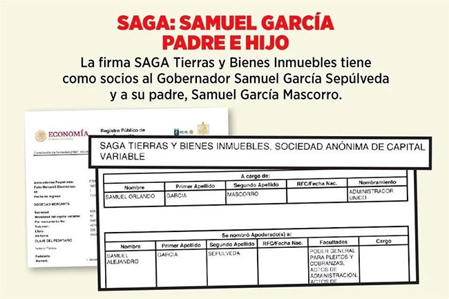 El terreno, donde el Gobernador pretende construir una residencia de casi 2 mil 800 metros cuadrados, está a nombre de SAGA Tierras y Bienes Inmuebles, empresa encabezada por el Mandatario emecista y su padre, Samuel García Mascorro.