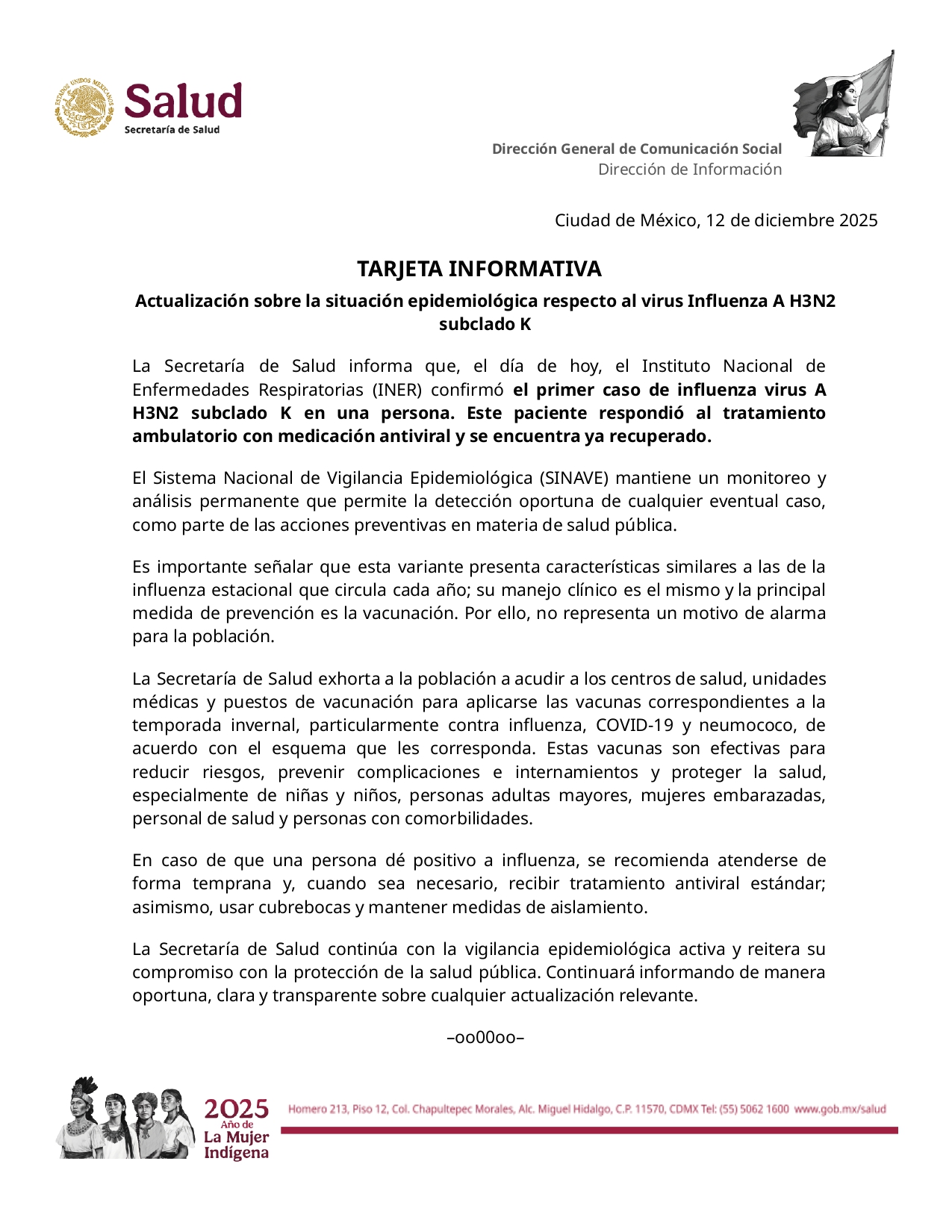 A través de una tarjeta informativa, la autoridad sanitaria precisó que el caso fue localizado por el Instituto Nacional de Enfermedades Respiratorias (INER) en una persona que ya se encuentra completamente recuperada tras recibir tratamiento ambulatorio.