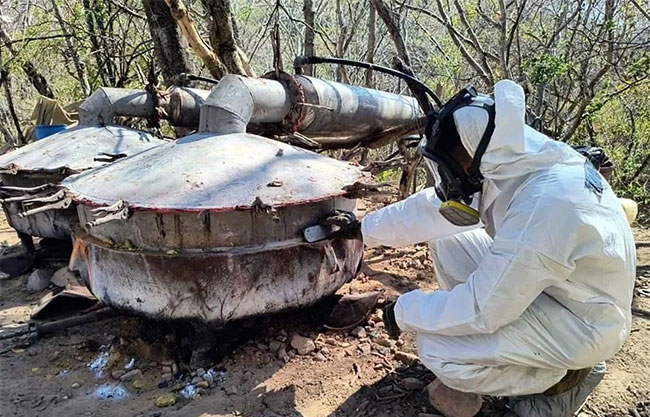 Además, los efectivos navales y de la FGR aseguraron dos reactores con capacidad de 500 litros, dos condensadores de 200 litros, tambos, 37 bidones, 14 cilindros de gas LP, un motogenerador, bombas sumergibles y diverso equipo de procesamiento, lo que evidencia la capacidad operativa del laboratorio para la producción a gran escala.