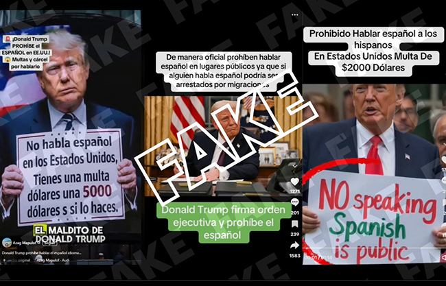 Mensajes en redes sociales como Facebook y TikTok han compartido videos afirmando que el presidente de Estados Unidos, Donald Trump, aprobó una ley para sancionar a quienes hablen español en espacios públicos del país.