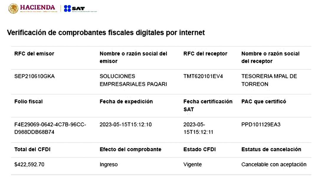 Pese a tratarse de diferentes e independientes “empresas”, el timbrado electrónico curiosamente fue realizado en algunos casos con diferencia de minutos, lo cual exhibe que fue perpetrado por la misma persona. El 15 de mayo de 2023, para dimensionar, Paqari facturó a las 15:12 horas con 11 segundos una cifra de 422 mil 592 pesos al Ayuntamiento de Torreón, en tanto que MMXXII hizo lo propio a las 15:14 horas con 52 segundos la cantidad de 427 mil 210 pesos.