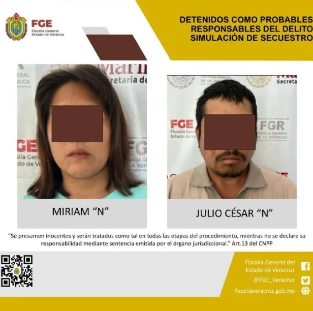Xalapa.- Un hombre y una mujer han sido señalados como cómplices en la simulación de un secuestro en el municipio de Las Choapas, al sur de Veracruz. De acuerdo con las investigaciones de la Fiscalía General del Estado (FGE), Miriam N habría fingido su privación de libertad con el fin de extorsionar a su familia.