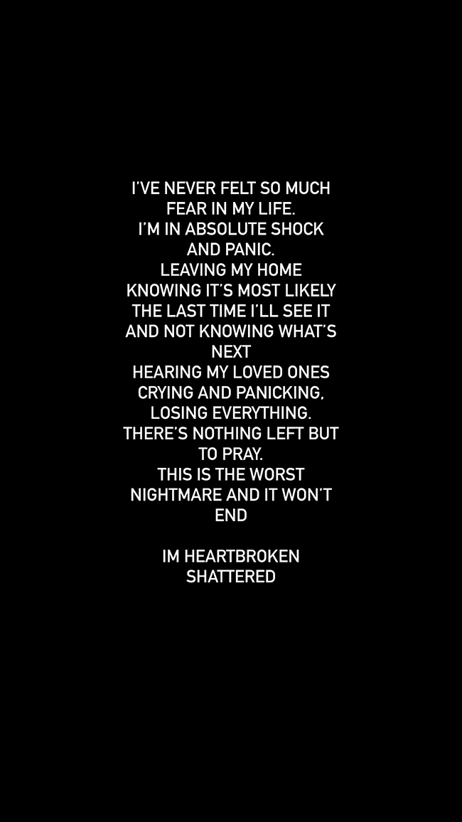 “ Escuchar a mis seres queridos llorando y entrando en pánico, perdiéndolo todo. No queda nada más que rezar. Esta es la peor pesadilla y no termina. Tengo el corazón roto… destrozado”, añadió.