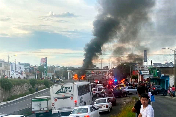 Tras ser sorprendidos en su reunión por el Ejército y luego de algunas detenciones, el CJNG provocó una violenta reacción de integrantes de esa agrupación que incendiaron taxis, autobuses, coches particulares, comercios y tiendas de conveniencia en localidades de Jalisco y Guanajuato.
