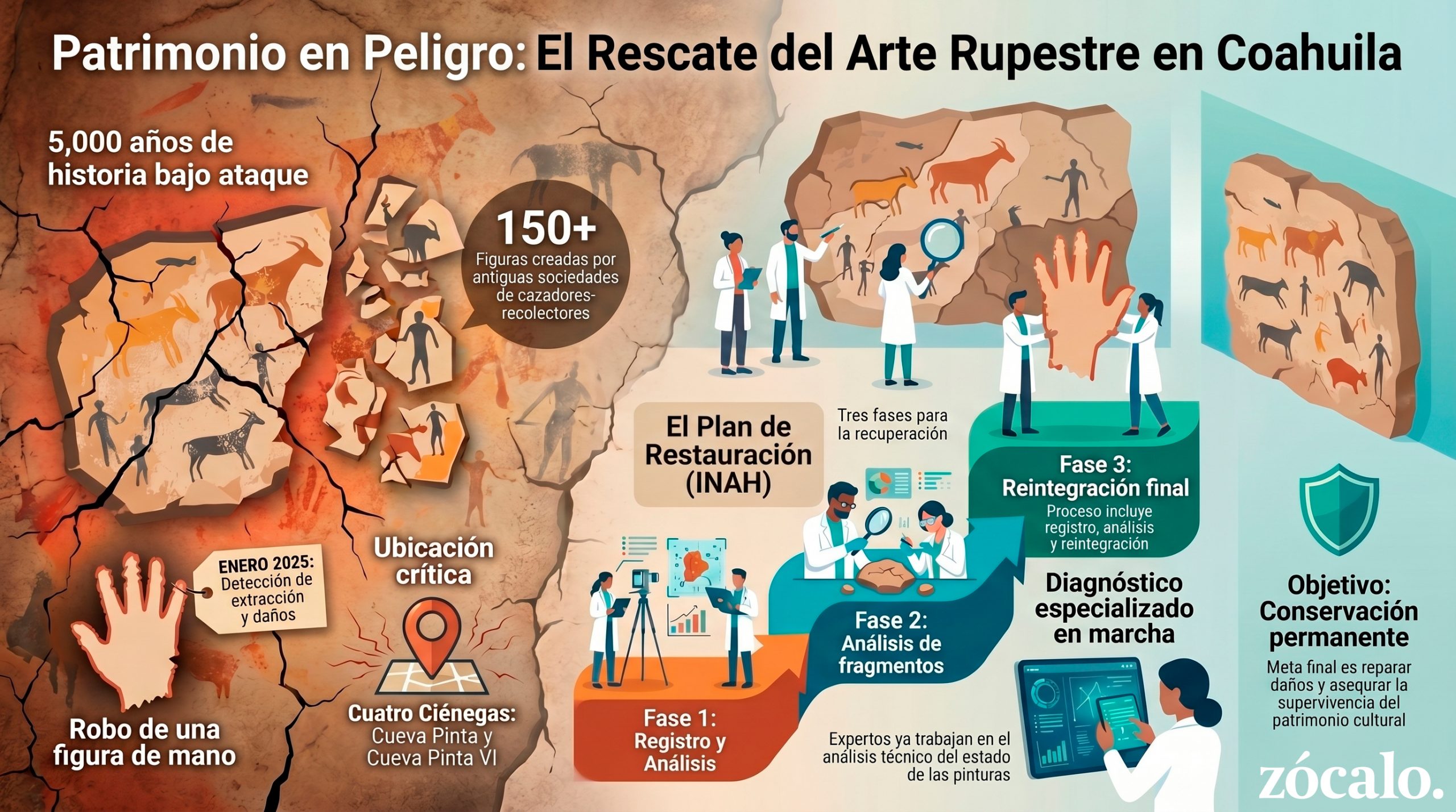 Cuatro Ciénegas, Coah.- En seguimiento a los hechos ocurridos en enero de 2025, cuando dos abrigos rocosos con manifestaciones gráfico-rupestres en el municipio de Cuatro Ciénegas, Coahuila, sufrieron afectaciones, el Instituto Nacional de Antropología e Historia (INAH), a través del Centro INAH Coahuila y la Coordinación Nacional de Conservación del Patrimonio Cultural (CNCPC), inició formalmente los trabajos de conservación y restauración de los sitios Cueva Pinta y Cueva Pinta VI.