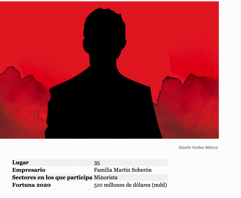 La familia Martín Soberón es accionista de Organización Soriana; la compañía ha resentido un menor dinamismo en ventas en sus tiendas, afectado por el entorno económico y cierre de sucursales por la pandemia en 2020
