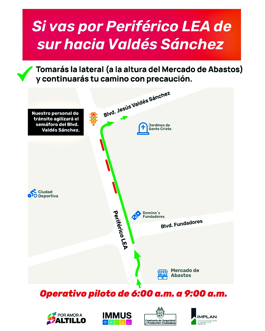 La primera de ellas es, que al llegar al distribuidor Vial, usen el deprimido, para continuar por los dos carriles laterales de LEA hasta el bulevar Valdés Sánchez, donde habrá personal de tránsito para agilizar la circulación, para después incorporarse, ya sea al periférico Luis Echeverría Álvarez o al bulevar Nazario Ortiz Garza.
