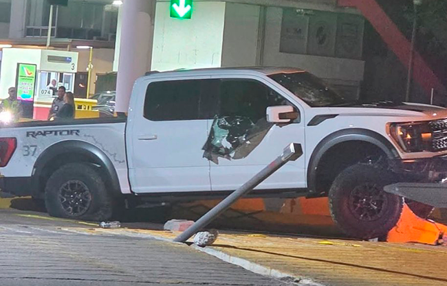 A bordo de una camioneta pick up marca Ford Raptor, de reciente modelo, el sujeto trató de saltar por un muro de concreto que sirve de contención.