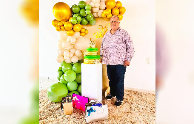 Sus compañeros de trabajo lo colmaron con buenos deseos, su familia organizó una alegre fiesta la cual se llevó a cabo en la comodidad de un salón para eventos sociales.