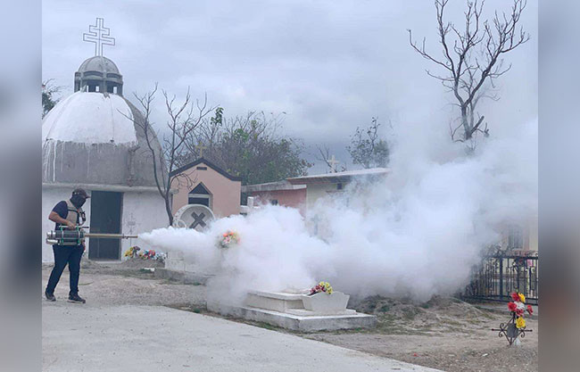 Villa Unión, Coah.- Mediante la Coordinación Municipal de Salud y junto a la Jurisdicción Sanitaria número 1 de Piedras Negras, llevamos a cabo una fumigación para evitar la reproducción del mosquito transmisor del dengue, en los panteones de Rosales, Gigedo y del ejido Charcos.