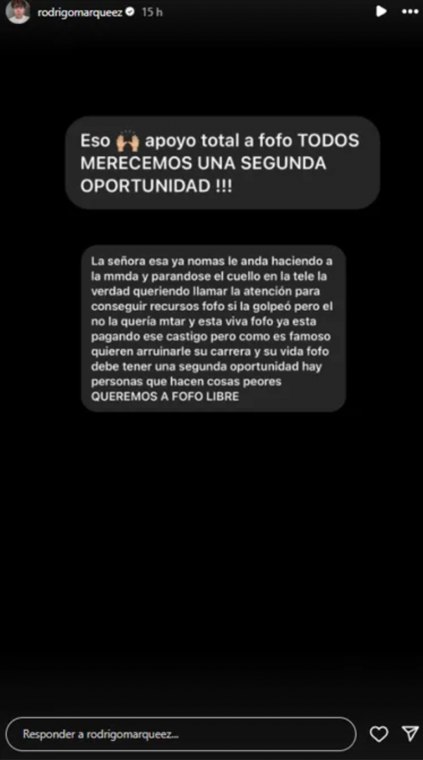 “ ¡Eso! Apoyo total a ‘Fofo’. ¡Todos merecemos una segunda oportunidad!”, escribió ‘Ro’ Márquez en una historia de Instagram.