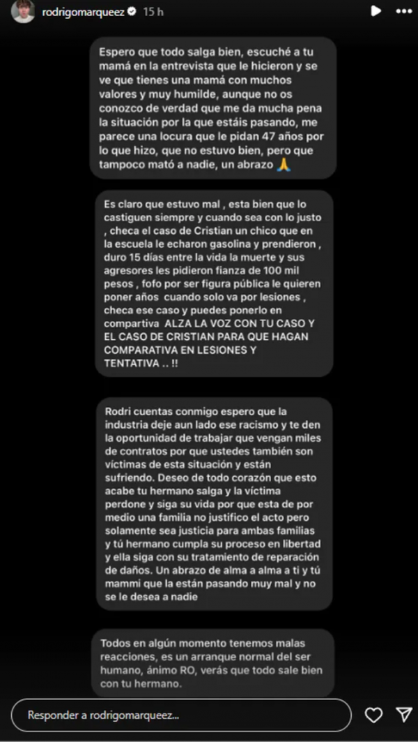 “ Espero que todo salga bien, escuché a tu mamá en la entrevista que le hicieron y se ve que tienes una mamá con muchos valores y muy humilde, aunque no los conozco de verdad que me da mucha pena la situación por la que estáis pasando, me parece una locura que le pidan 47 años por lo que hizo, que no estuvo bien, pero que tampoco mató a nadie, un abrazo”, presuntamente le escribió un internauta a ‘Ro’ Márquez.