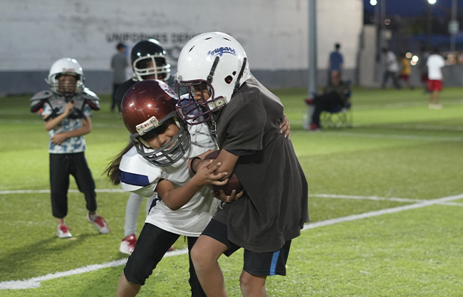 Entre las filas del club destaca también Marilú Reyes, una niña de apenas 10 años que encontró en el emparrillado un espacio para brillar. Siendo liniera ofensiva, se abre paso con decisión y madurez: “Por el juego, por mis compañeros, por mi hermano y porque me gustan los golpes”, dice con una sonrisa.