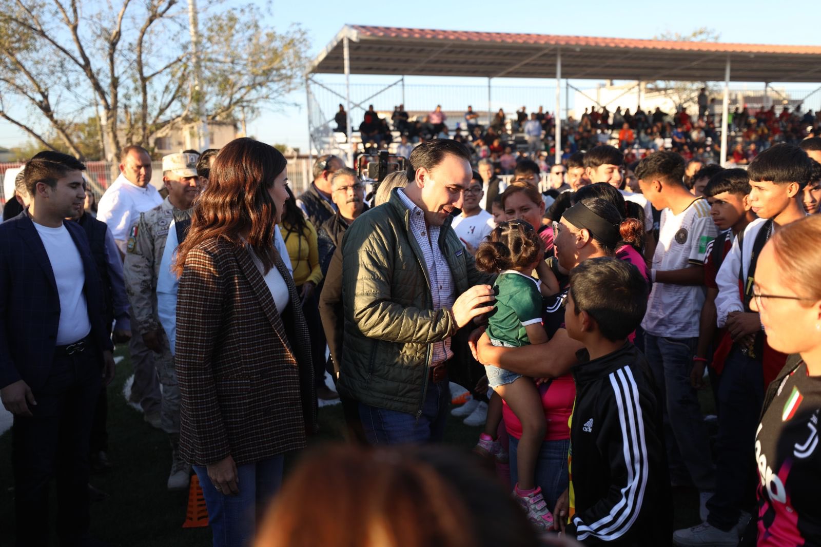 Acompañado por su esposa Paola Rodríguez López, el Gobernador de Coahuila detalló que en esta cancha se mejoraron las instalaciones, se instaló pasto sintético, se construyeron vestidores con baño y una banca para los jugadores, y se realizó una zona de esparcimiento y descanso con mesas de pícnic, para brindar esparcimiento a las familias que acuden diariamente a la Macroplaza.