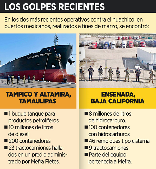 El esquema se puso en evidencia los últimos días de marzo con el aseguramiento de 18 millones de litros de huachicol en puertos de Tamaulipas y Baja California.