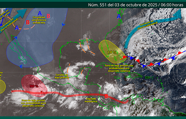 Adicionalmente, la circulación de un disturbio tropical sobre el océano Pacífico, con alto potencial de desarrollo ciclónico, también propiciará desarrollos tormentosos significativos en el Occidente del país.
