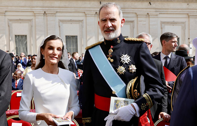 Al igual que hicieron el 19 de marzo de 2013, entonces como príncipes, en la misa de inicio del pontificado de Francisco, Felipe VI y la reina Letizia han asistido a la ceremonia en la que León XIV ha recibido el anillo del pescador y el palio, símbolos del poder pontificio.