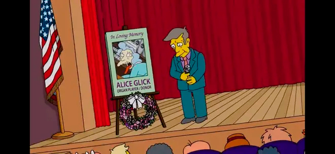 Todo ocurrió durante el episodio “Sashes to Sashes” de la temporada 37, emitido este domingo, en donde Alice Glick, la organista de la Primera Iglesia de Springfield, falleció repentinamente en plena misa, sin previo aviso y frente a un público que aún no se recupera del golpe.