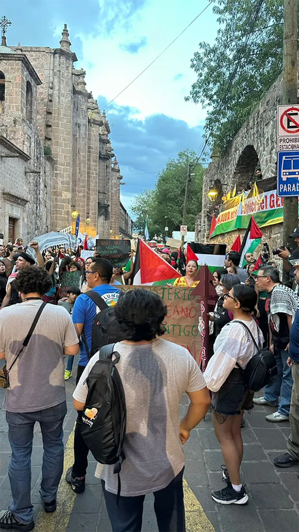 Morelia.- La tarde de este sábado, el Festival Internacional de Cine de Morelia fue testigo de una manifestación protagonizada por alrededor de cien personas que pedían un alto a la violencia en Palestina.