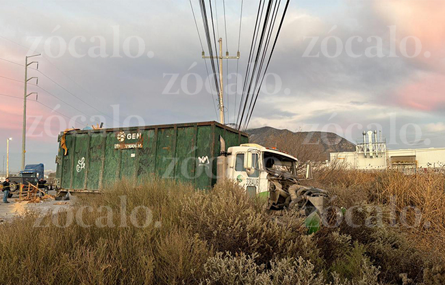 Saltillo, Coah.- Un fatal accidente vial registrado sobre la carretera estatal a Derramadero dejó como saldo la muerte de un trabajador del sector de recolección de residuos, tras un choque casi de forma frontal entre un camión de la empresa GEN y un tráiler de carga.