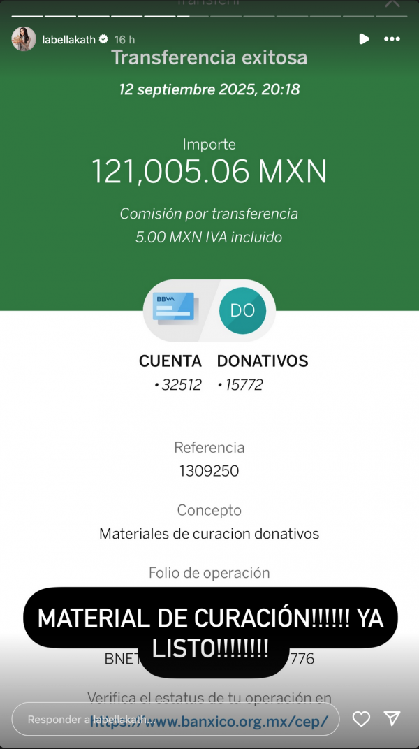 “ Material de curación, ¡ya listo!”, dice la historia en Instagram con la que Bellakath compartió la transferencia bancaria.
