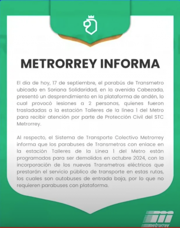 “ El día de hoy, 17 de septiembre, el parabús de Transmetro ubicado en Soriana Solidaridad, en la avenida Cabezada, presentó un desprendimiento en la plataforma de andén, lo cual provocó lesiones a dos personas, quienes fueron trasladadas a la estación Talleres de la Línea 1 del Metro para recibir atención por parte de Protección Civil del STC Metrorrey”.